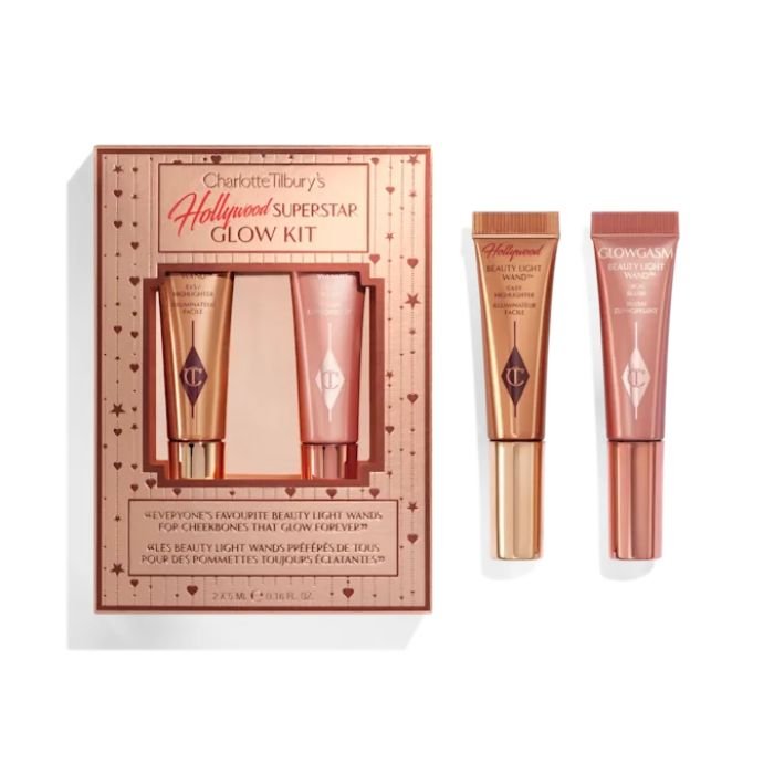 El Dreamy Superstar Glow Kit es un set de edición limitada de Charlotte Tilbury que incluye dos Mini Beauty Light Wands: el icónico Spotlight y el viral Pinkgasm. Ambos vienen en tubos de gel de brillo con aplicador tipo cojín (cushion applicator), diseñados para deslizarse suavemente sobre los pómulos y aportar un resplandor suave y radiante sin purpurina visible.